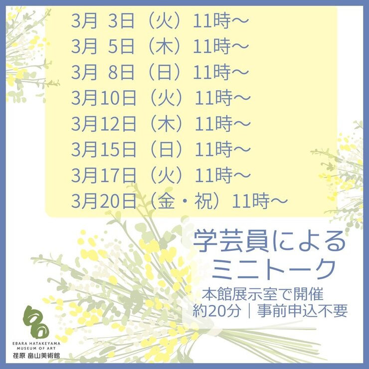 ご好評いただいている「学芸員によるミニトーク」につきまして、3月の開催日程が決まりましたのでお知らせいたします。